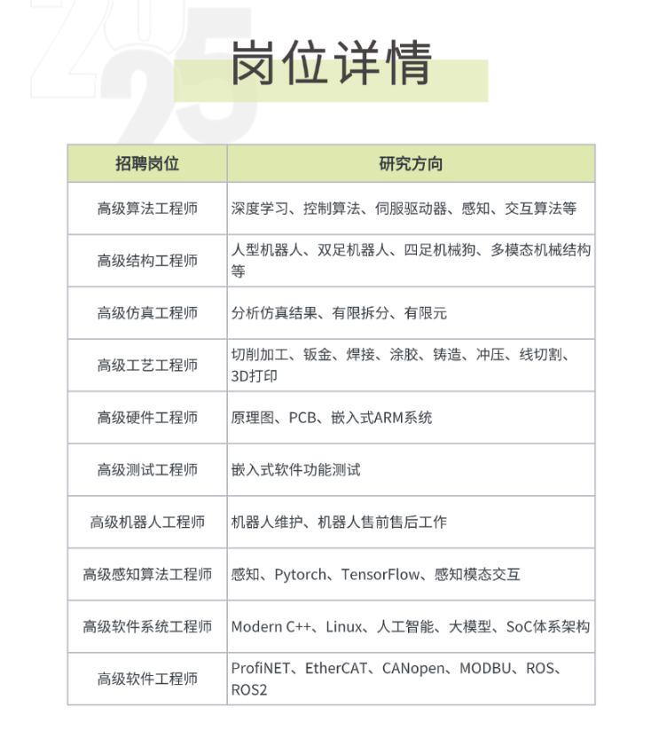 需要的专科包括机械类、自动化类、力学类、策动机类、数学类、电子信息类、电气类等。招聘岗亭主要波及高档算法工程师、高档结构工程师等,磋议主义波及深度学习、感知、东谈主形机器东谈主、四足机器狗等。